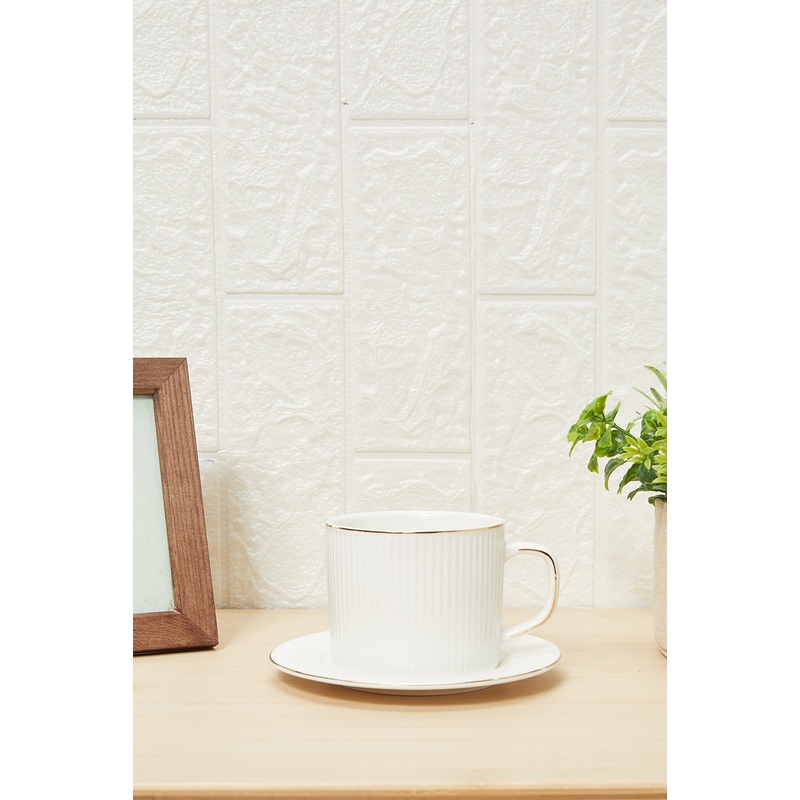 Add a touch of elegance to your tea time with this cup and saucer set featuring a delicate gold rim. The sophisticated design blends timeless charm with modern luxury, making it perfect for any occasion or a special gift.Section: Home-DiningColour: WhitePa
