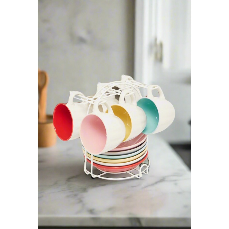 A delightful collection designed for espresso enthusiasts. This set includes six elegant espresso cups, six matching saucers, and a stylish stand for easy storage and display.Section: Home-DiningColour: WhitePattern: PlainSet Includes: 6x Cups 6x Saucers 1