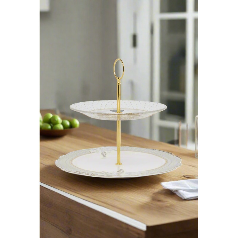 2-tier cake stand with an upper ring carrier made from durable material. Perfect for showcasing your best cakes to your loved ones in the most elegant way.Section: Home-DiningColour: WhitePattern: PrintedSize/Dimensions: (Top) Diameter 20.32cm, (Bottom) Di