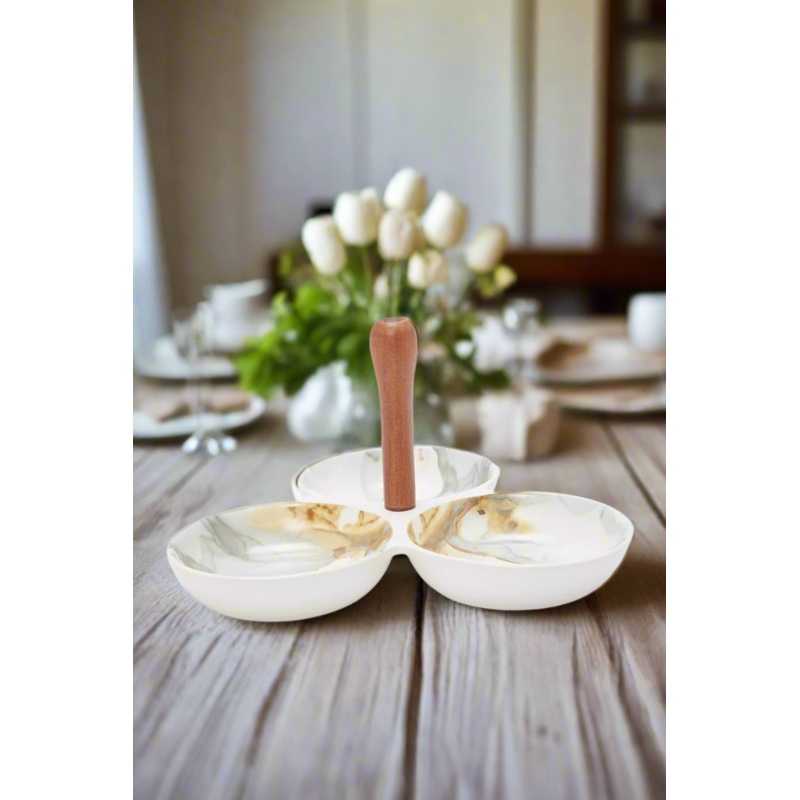 Practical and chic! This sectioned plate features a marble design and a comfortable wooden handle, ideal for serving a variety of snacks.