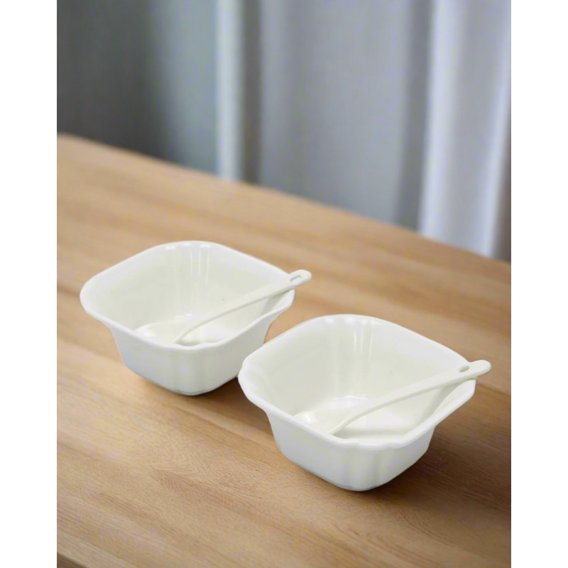 Serve in style with this beautifully crafted white bowls set, complete with two matching spoons for a seamless dining experience. Designed for versatility, these bowls are perfect for soups, snacks, or desserts, adding a touch of elegance to every meal.Sec
