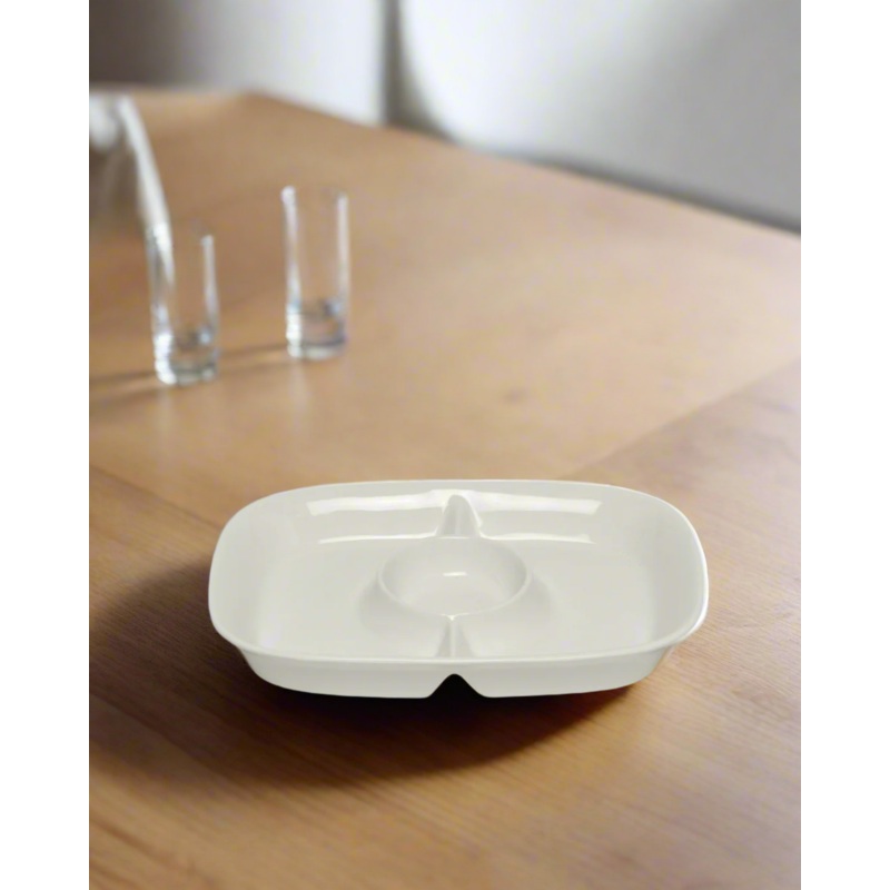 Practical and chic! This sectioned plate features a plain design that enhances its look and adds value to it, ideal for serving a variety of snacks.Section: Home-DiningColour: WhitePattern: PlainMaterial: New Bone ChinaStyle No: 131866509