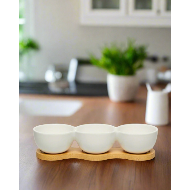 A round ceramic bowl paired with a bamboo trayelegant and functional, perfect for serving snacks, dips, or side dishes in style.Section: Home-DiningColour: WhitePattern: PlainSet Includes: 1x Bowl 1x Bamboo TraySize/Dimensions: Height 5.5cm x Diameter 27cm